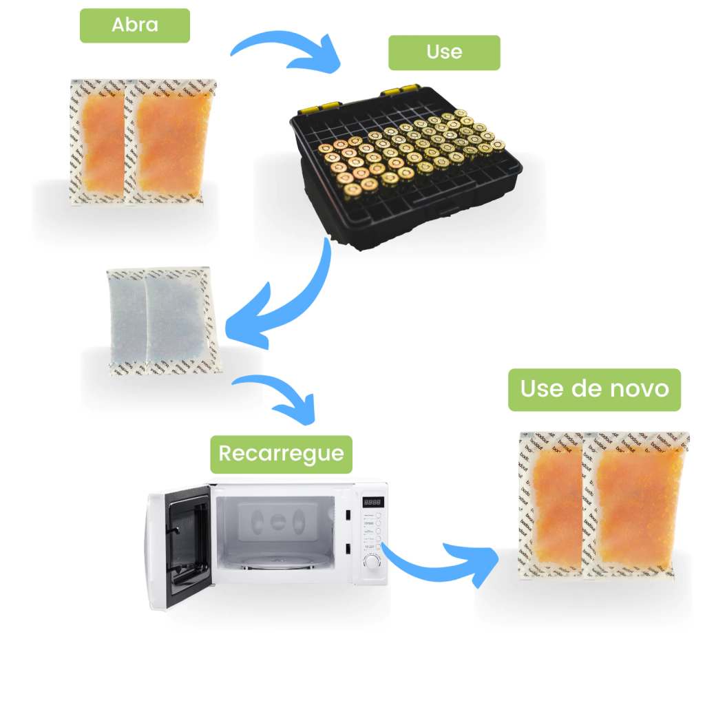 Os sachês inteligentes de sílica gel do Protect Shot absorvem a umidade de forma contínua e silenciosa, sem exigir energia elétrica ou manutenção complexa.